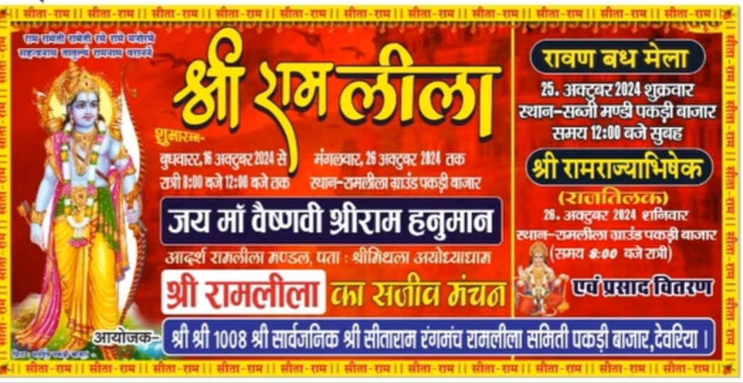 - श्री राम राज्याभिषेक रामलीला ग्राउंड पकड़ी बाजार में होगा।