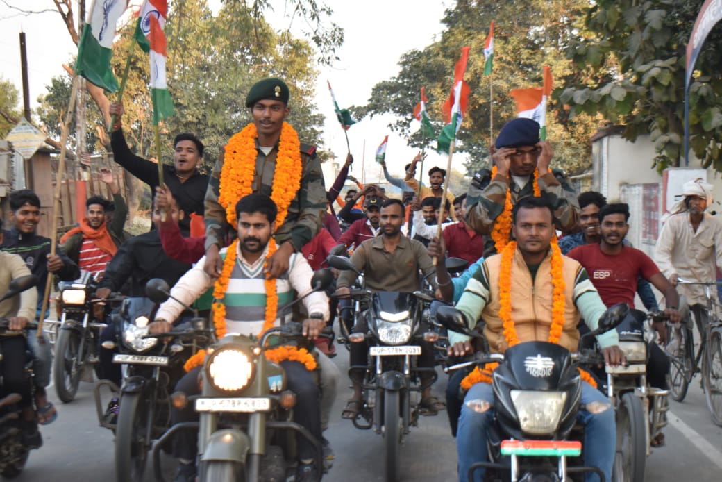 फौजी बनकर घर लौटे संदीप यादव व दिलीप कुमार का भव्य स्वागत
